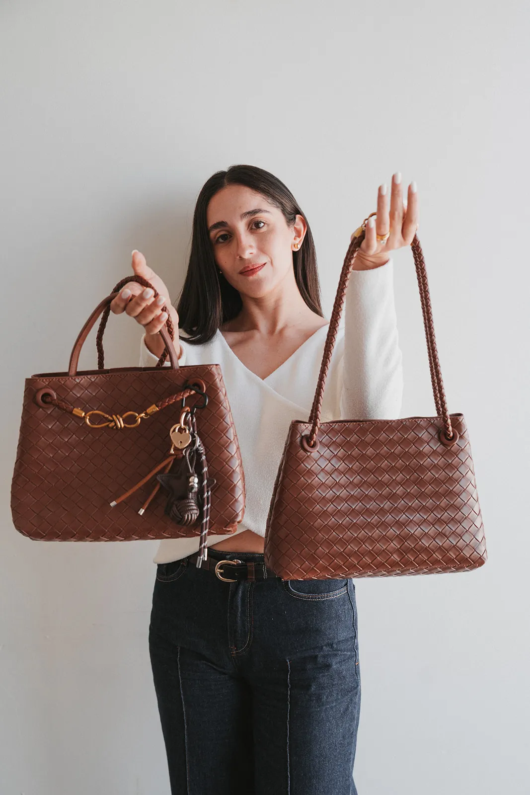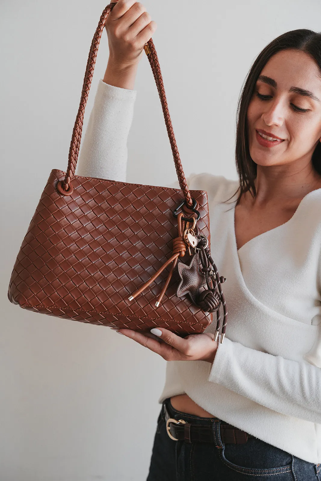 Bolsa de gran capacidad para mujer, estilo tejido a mano, elaborada en piel PU con herrajes dorados, cierre magnético, y correa ajustable. Ligera con medidas de 25 cm x 20 cm x 12 cm. Incluye: Llavero artesanal en forma de estrella y llave con candado de corazón dorado.